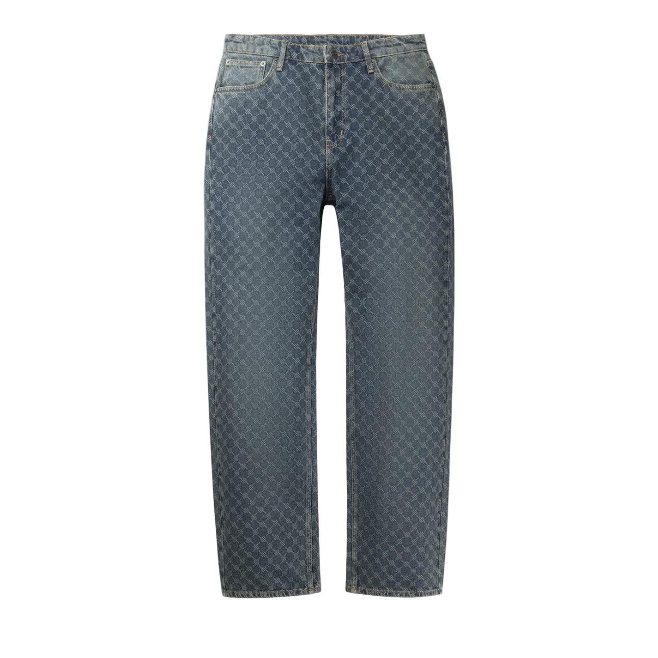 I jeans presentano una stampa monogram laserata su tutta la superficie. Questi classici pantaloni in denim hanno una gamba dritta, chiusura con zip, tasche anteriori e posteriori e una patch in finta pelle sul retro della cintura.